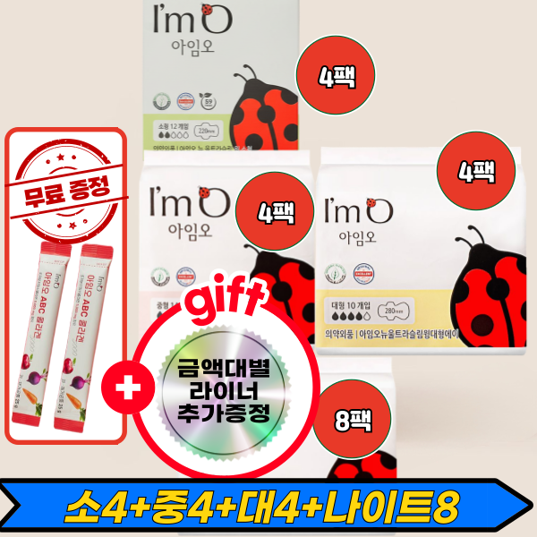 [사은품증정][8팩구성][유기농 생리대 아임오] 초특가+증정품(소,중,대,라이너,롱라이너,나이트)