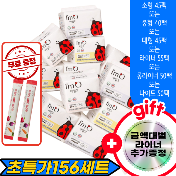 [금액대별증정][초특가 156천원 단품Big][아임오 유기농 생리대][콜라겐or풋사과젤리 증정] 소형 45개/중형 40개/대형(10P) 45개/라이너(20P) 55개/롱라이너