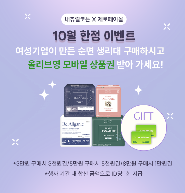 [내츄럴코튼] 시그니처 오가닉 유기농 생리대 중형/대형/오버나이트/롱 라이너 10팩 모음전