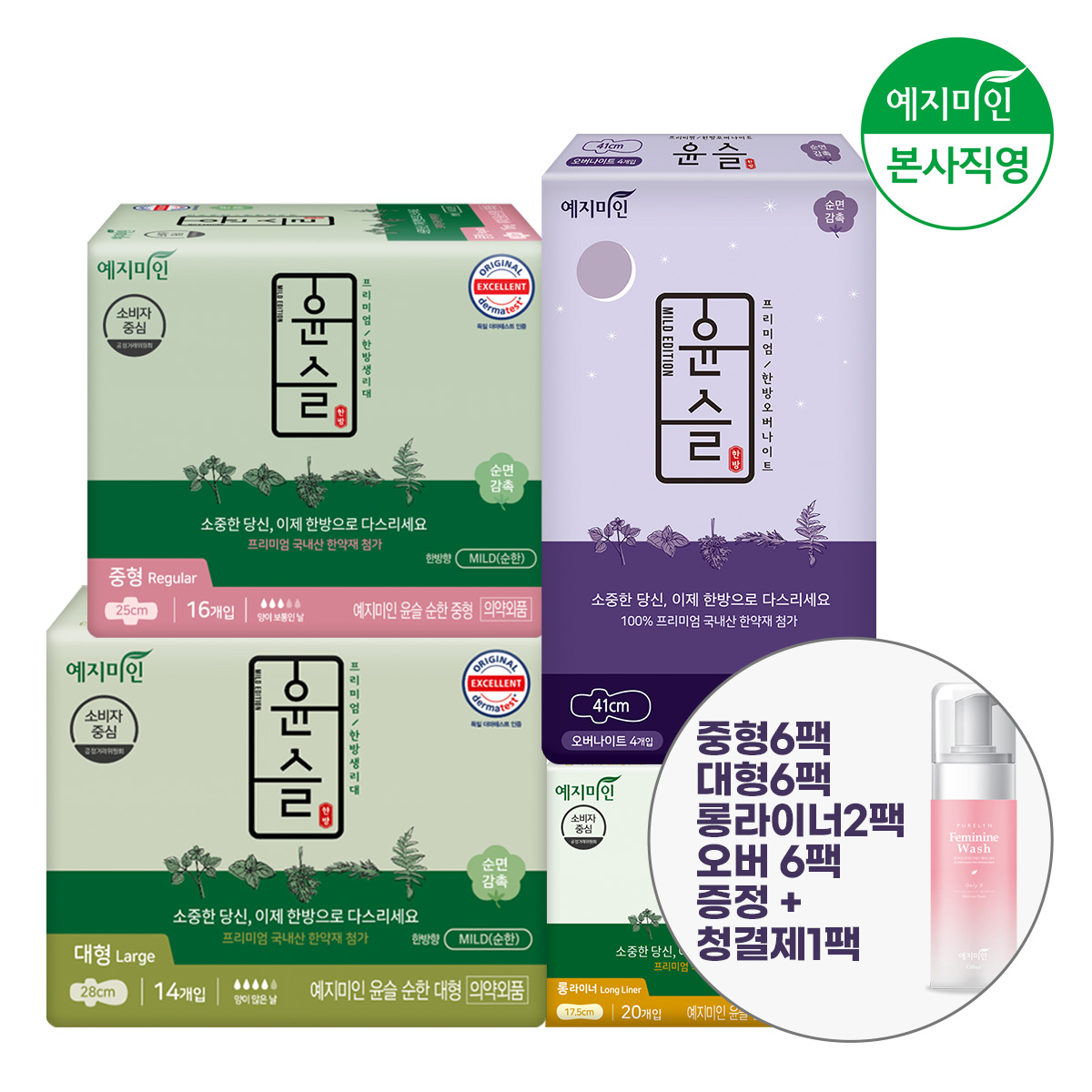 [한방]윤슬 중형16Px6팩, 대형14Px6팩, 롱라이너20Px2팩, 오버나이트4Px6팩 + 청결제 1팩 증정