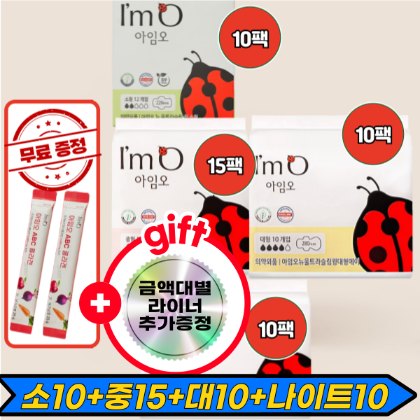 [사은품증정][초특가 156천원 구성][아임오 유기농 생리대] 소형(12P) 10팩+중형(14P) 15팩+대형(10P) 10팩+나이트(6P) 10팩