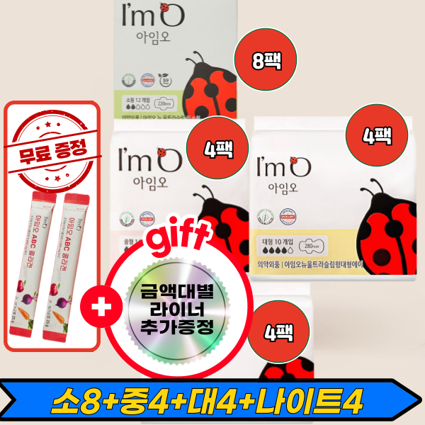 [사은품증정][초특가 78천원 구성][아임오 유기농 생리대] 소형(12P) 8팩+중형(14P) 4팩+대형(10P) 4팩+나이트(6P) 4팩