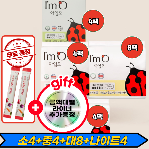 [사은품증정][초특가 78천원 구성][아임오 유기농 생리대] 소형(12P) 4팩+중형(14P) 4팩+대형(10P) 8팩+나이트(6P) 4팩