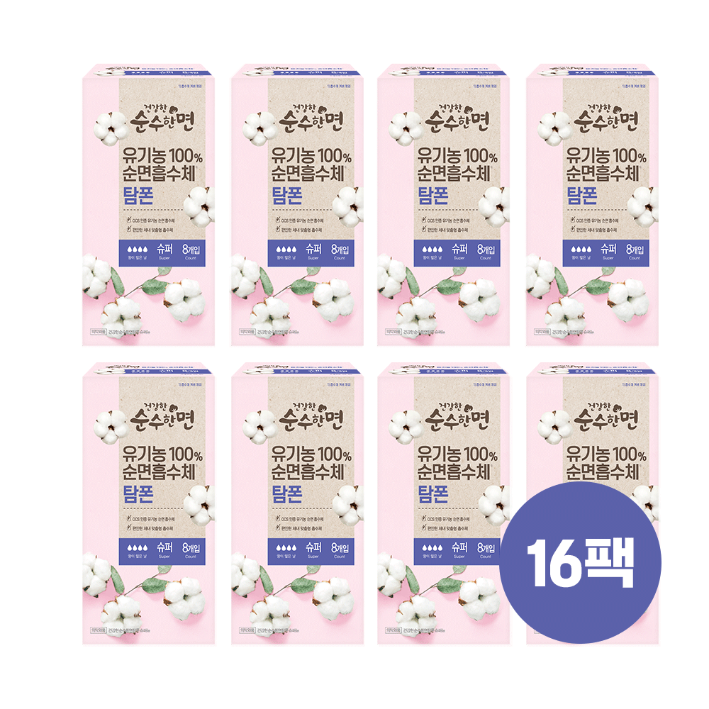 [깨끗한나라] ★행사 진행중★ 건강한 순수한면 유기농 순면 탐폰 슈퍼 8개입 x 16팩